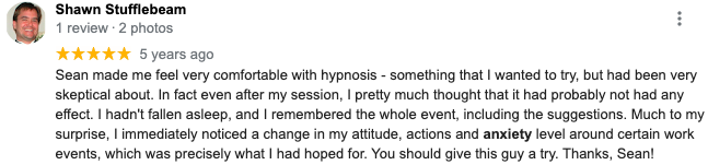 Sean Wheeler is an excellent hypnotist. I felt safe and gently guided toward my goals. Sean would listen ahead of the hypnosis to find the right words and suggestions to use in hypnosis to further my goals. I listen to his hypnosis recordings almost daily to further lessen my stress and anxiety and IT WORKS. I am going to send my daughter to him. That is how much I trust his work.